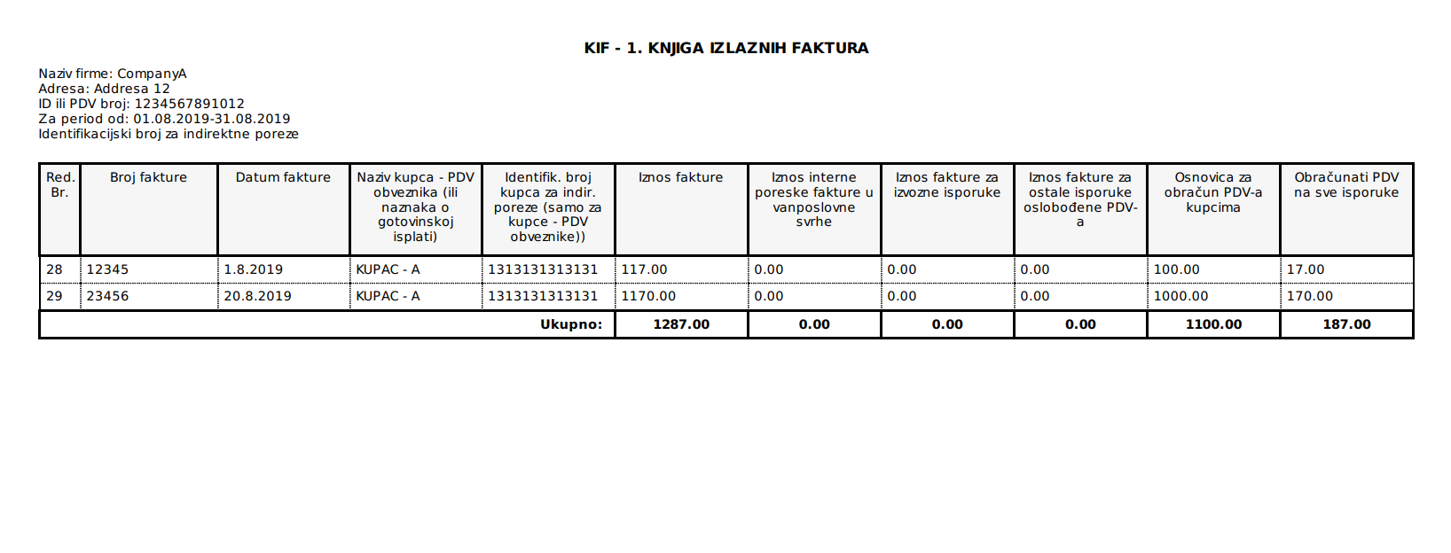 Svi izlazni računi/fakture bit će zavedeni u Knjizi izlaznih faktura skladu Pravilnikom o primjeni Zakona o porezu na dodatu vrijednost. Knjiga izlaznih faktura se vodi za svaki mjesec odvojeno. Zbir određenih kolona iz KIF-a se prenosi u određena polja PDV prijave ukoliko ste registrirani PDV obveznik.
